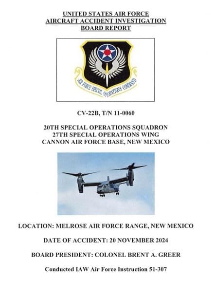 Today, Air Force Special Operations Command released an Accident Investigation Board report on a CV-22B Osprey mishap that occurred Nov. 20, 2024, near Melrose Air Force Range, N.M. The aircraft and crew were assigned to the 27th Special Operations Wing’s 20th Special Operations Squadron, at Cannon AFB, N.M. The mishap resulted in no injuries or fatalities nor damage to civilian property. The estimated cost of damage to government property was valued at approximately $2.8 million.