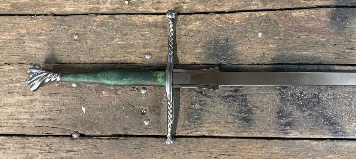 Today we compare our standard feder called the Fechterspiel, which means “assault of arms”, with a custom piece in gothic style. Both feature our standard 37.75 inch 6150 carbon steel feder blade with our iconic and elegant schilt design and leather covered hand carved ash wood grip. The custom feder features a writhed pommel based on an example in the Wallace Collection and a guard modified from our German Bastard Sword.
