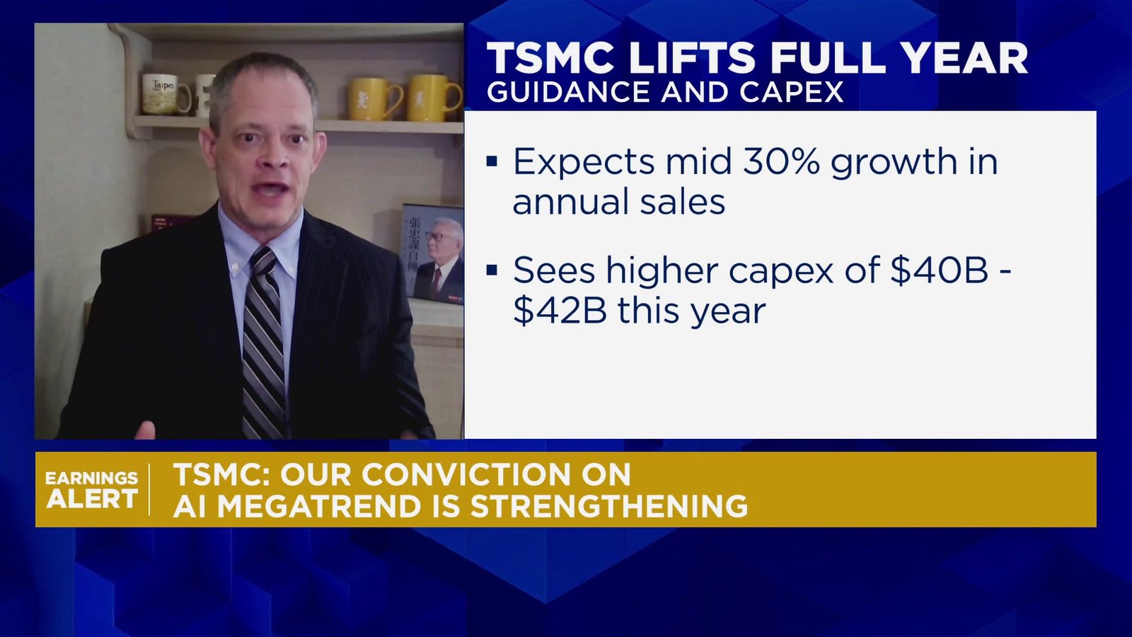 Dan Nystedt of TriOrient Investments says the outlook for TSMC remains positive due to their leadership in manufacturing the leading-edge chips. He also discusses the recent number of AI deals and highlights the importance of having financial companies joining the AI revolution.
