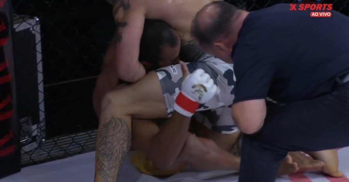 Lima keeps adjusting his grip, and just before he gives the thumbs up, you can kind of see him open his hand and make a move towards Oliveira’s hip, but it’s far from a clear sign of submission. For some reason, it’s the thumb that causes Rodrigues to immediately spring into action and make the call.