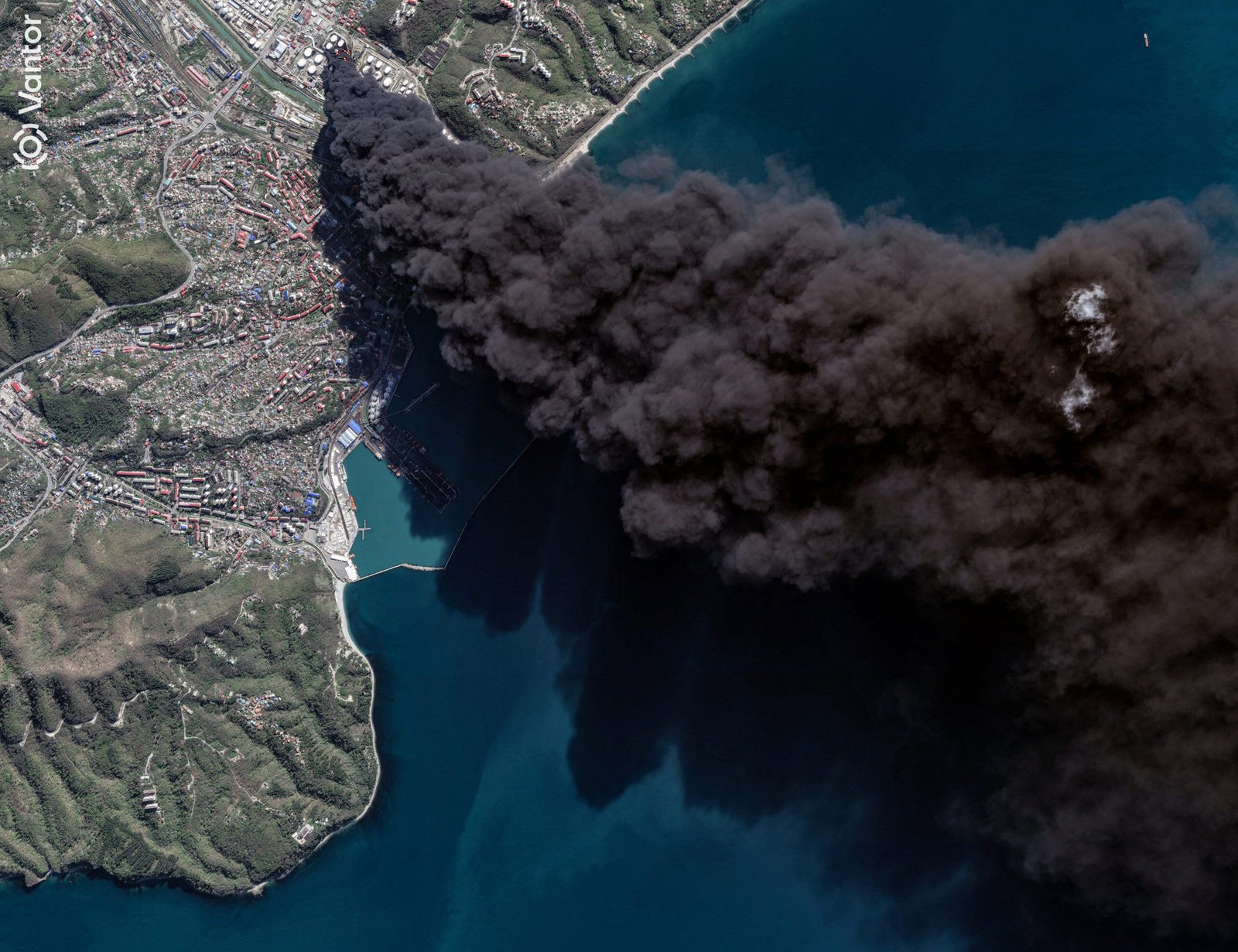 Image: A satellite image shows smoke billowing from fire, following Ukrainian drone attacks on a Russian oil facility in the Black Sea port of Tuapse, Krasnodar Krai, Russia. April 16, 2026. (Vantor/Handout via REUTERS)
