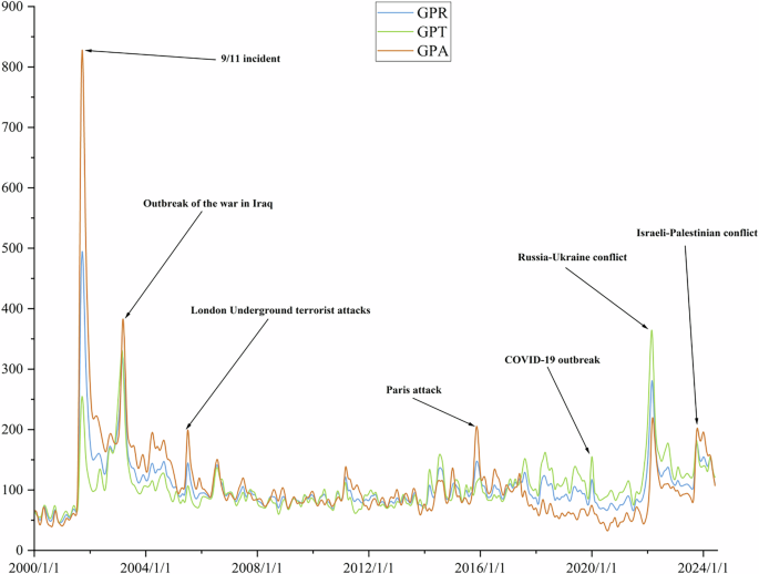 Figure 1 displays the dynamic changes in the monthly geopolitical risk (GPR) index from January 2000 to July 2024. The figure reveals several significant peaks closely associated with major international events during this period. Between 2000 and 2005, the GPR index experienced dramatic fluctuations. The peak around September 2001 corresponds to the terrorist attacks by Al-Qaeda against the United States. The peak around March 2003 relates to the Iraq War. The high point in late 2015 primarily stems from a series of terrorist attacks in France. After 2016, the notable intensification of global geopolitical risk led to further increased volatility, a trend that persisted until 2020 with several smaller peak fluctuations occurring during this time. Starting in 2020, the GPR index reflects another significant surge in geopolitical risk volatility, driven by critical factors including the global COVID-19 pandemic, the Russia-Ukraine War, and the Israeli-Palestinian conflict.