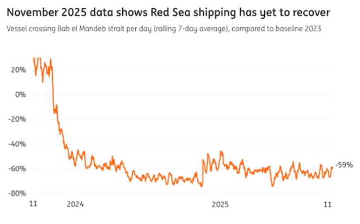 Figure 1: Traffic trends in the Red Sea Route between November 2023 and November 2025. (Source: Hellenic Shipping News)